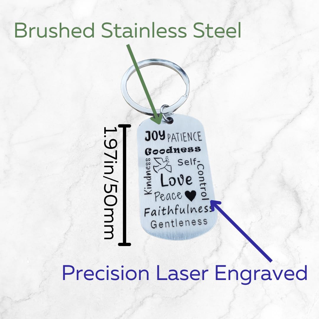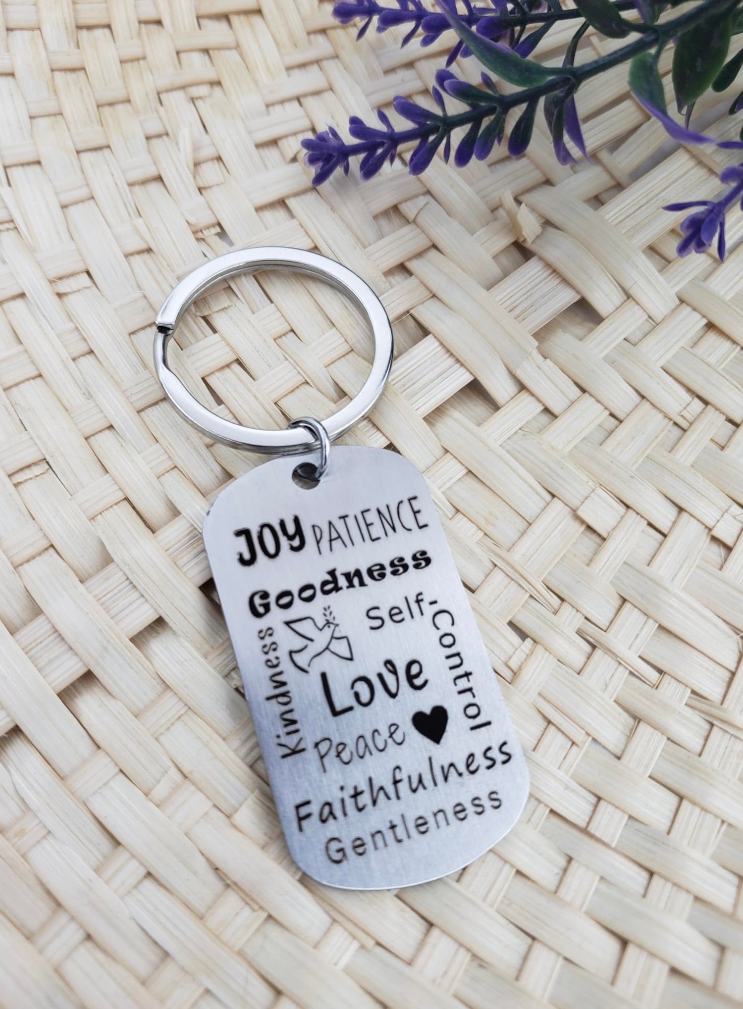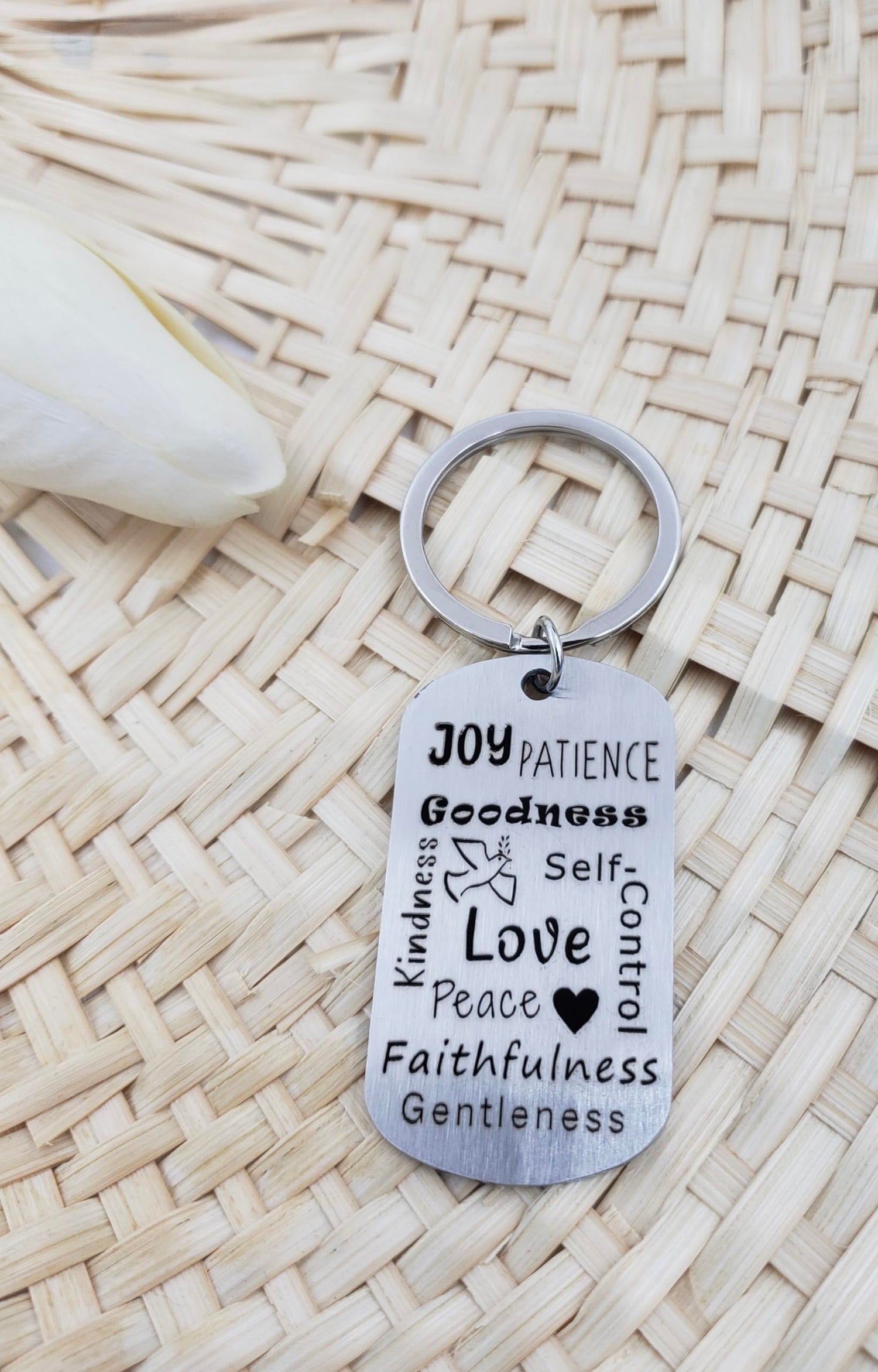 - Christian Keychain, a thoughtful gift that carries the message of faith and love. This religious keychain serves as a daily reminder of the Fruit of the Spirit, making it an ideal Christian gift for women. Whether it's for best friend gifts, a loved one on the mend to get well soon gifts for women, or as a token of inspiration, this keychain is a symbol of spiritual strength. Place on key ring or add bible accessories for a little inspiration during the busy day.