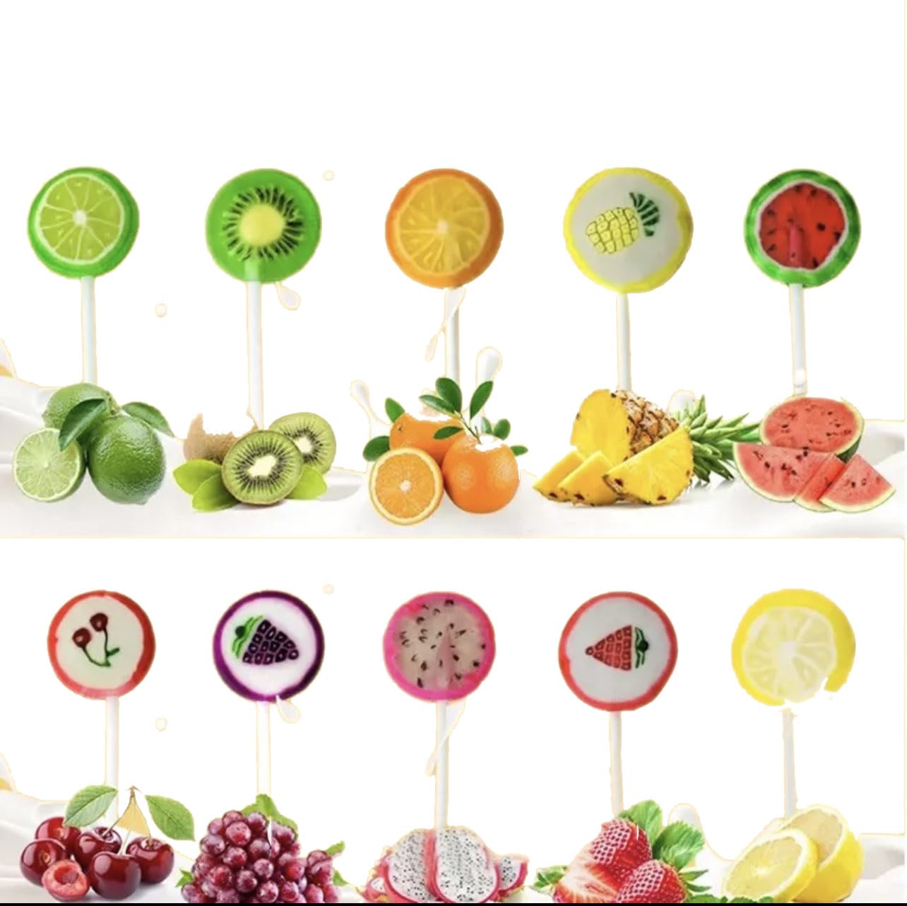 Details: Brand: RBBZ Party Flavor: Watermelon, Kiwi, Orange, Lemon, Pineapple, Grape, Cherry and Strawberry Size: 1.25" sucker on a 4" plastic stick.