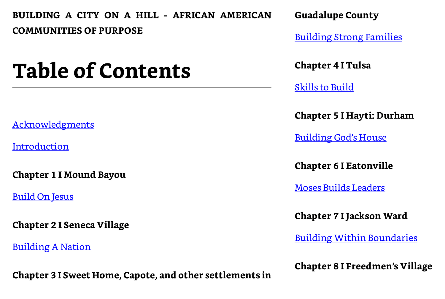 Building A City On A Hill: African American Communities of Purpose Student Workbook explores how we can shine for Jesus by demonstrating Christian character wherever God has placed us. Each chapter reminds us that God calls us to be Christians at home, at work, and in the community. This call enables us to change lives and foster economic development, which causes families and communities to flourish. A revisit of historic Black towns showcases the self-sufficient businesses and enterprises that African Americans built after emancipation. Vocational excellence, unselfish service, and an awareness that God is at work in each life are key to this curriculum.