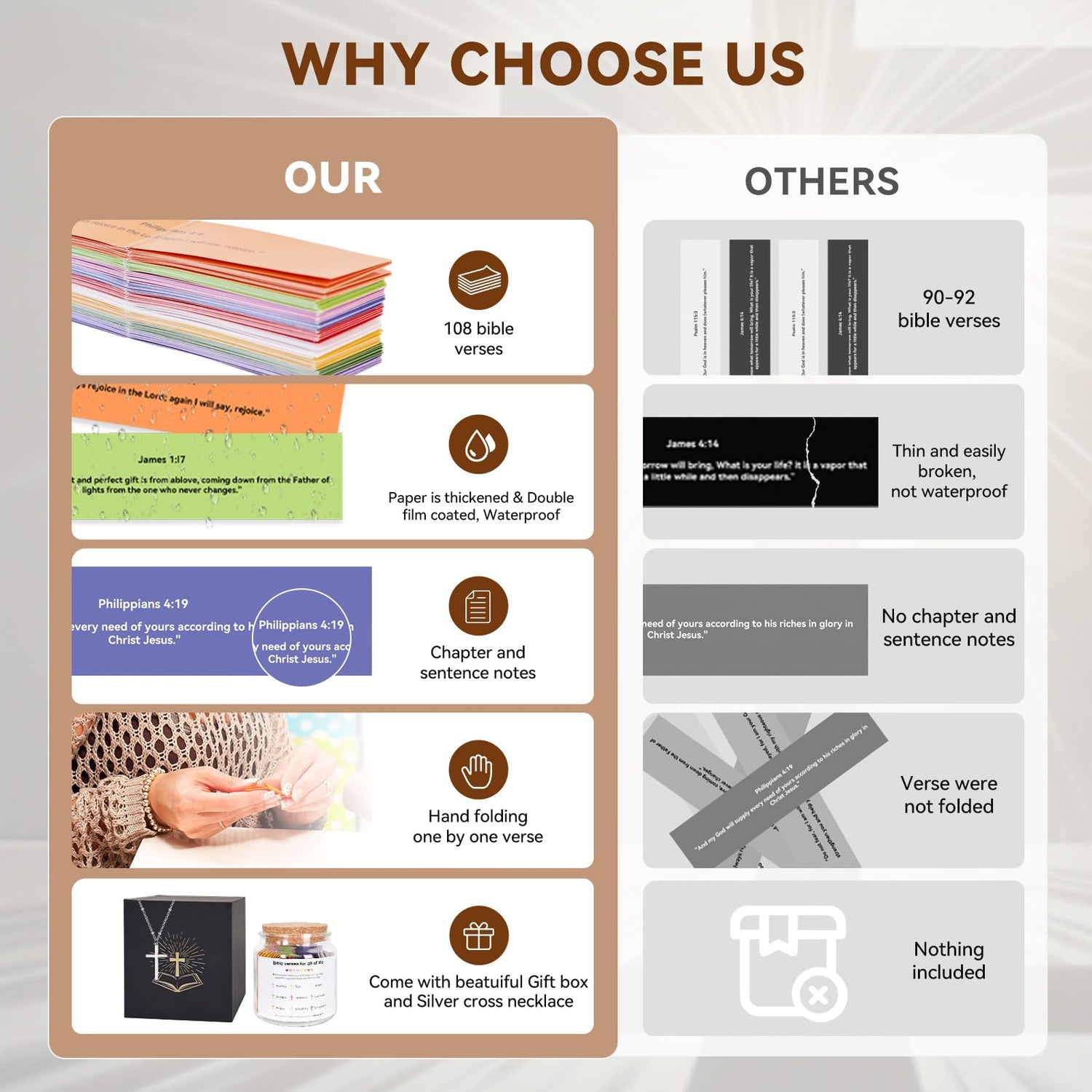 - 【108Pcs Hope Jar Bible Verses】With 108Pcs color-coded scripture verses, this verses covers 9 different emotions and feelings. When you feel anxious, sad, afraid, discontent, you can find answers from the wise words of God and Jesus.